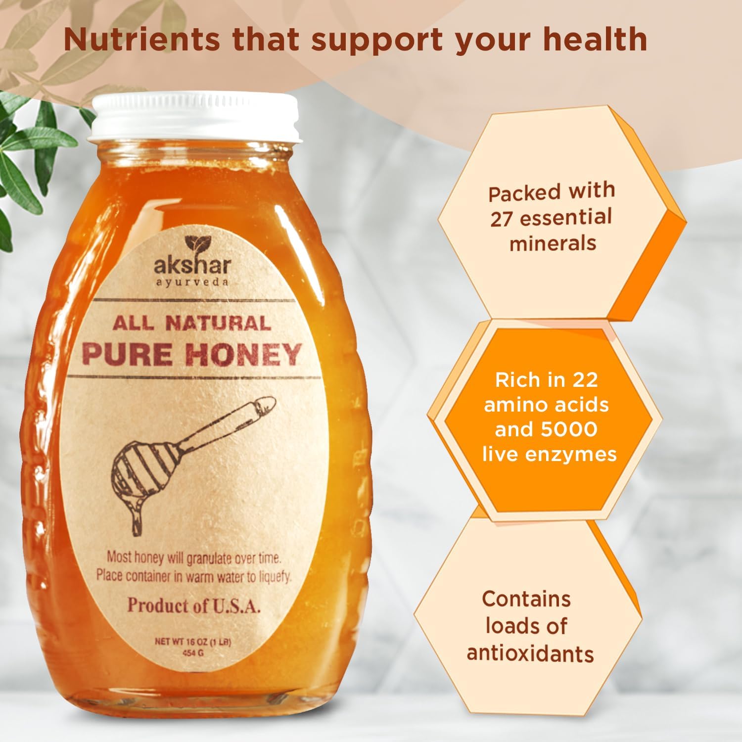 - DELICIOUS PURE HONEY - Enjoy delicious servings of one of mother nature's sweetest superfoods. Akshar Ayurveda pure honey contains no additional additives, no added sugar, no corn syrup, flavorings, or oils. Just delicious antioxidant rich pure honey.