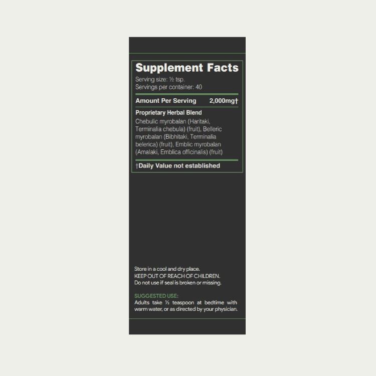 Each capsule contains an herbal blend of chebulic myrobalan extract (haritaki fruit); belleric myrobalan extract (bibhitaki fruit); and emblic myrobalan extract (amalaki fruit) for balancing tri-dosha.